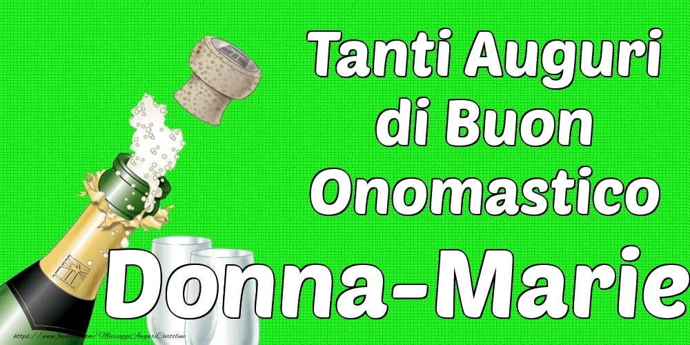 Cartolina con nome Donna-Marie di onomastico con champagne e bicchieri su sfondo verde e frase di buon onomastico Tanti Auguri di Buon Onomastico Donna-Marie.