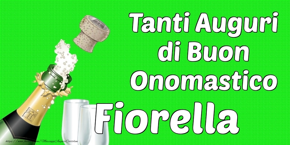 Cartolina con nome Fiorella di onomastico con champagne e bicchieri su sfondo verde e frase di buon onomastico Tanti Auguri di Buon Onomastico Fiorella.