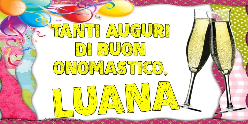 Scopri questa cartolina con bicchieri di champagne e palloncini unica e personalizzata per la festa dell'onomastico e preparati a condividere un momento di gioia e felicità con il destinatario. Che tu stia inviando il messaggio a distanza o desideri sorprendere la persona amata, questo biglietto di auguri con il nome Luana renderà la festa dell'onomastico davvero speciale e memorabile. Questo biglietto di auguri di onomastico con nome Luana può essere scaricata gratis o inviare tramite Whatsapp, Facebook, Twitter, Pinterest. Immagine di buon onomastico con bicchieri di champagne e palloncini e dimensioni 800px x 400px.