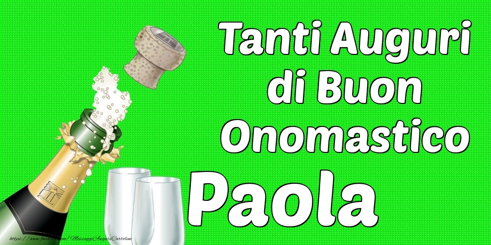 Tanti Auguri di Buon Onomastico Paola | Cartolina con champagne e bicchieri su sfondo verde | Cartoline di onomastico