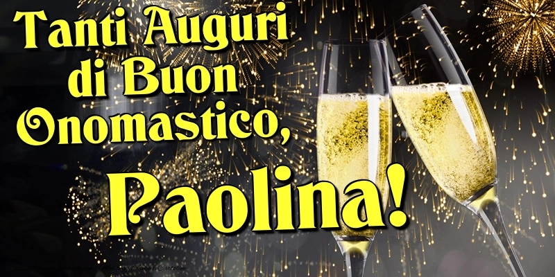Cartolina con nome Paolina di onomastico con bicchieri di champagne e fuochi d'artificio e frase di buon onomastico Tanti Auguri di Buon Onomastico, Paolina.