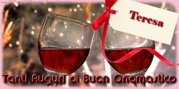 Scopri questa cartolina con bicchieri da vino per uomo o donna unica e personalizzata per la festa dell'onomastico e preparati a condividere un momento di gioia e felicità con il destinatario. Che tu stia inviando il messaggio a distanza o desideri sorprendere la persona amata, questo biglietto di auguri con il nome Teresa renderà la festa dell'onomastico davvero speciale e memorabile. Questo biglietto di auguri di onomastico con nome Teresa può essere scaricata gratis o inviare tramite Whatsapp, Facebook, Twitter, Pinterest. Immagine di buon onomastico con bicchieri da vino per uomo o donna e dimensioni 600px x 300px.