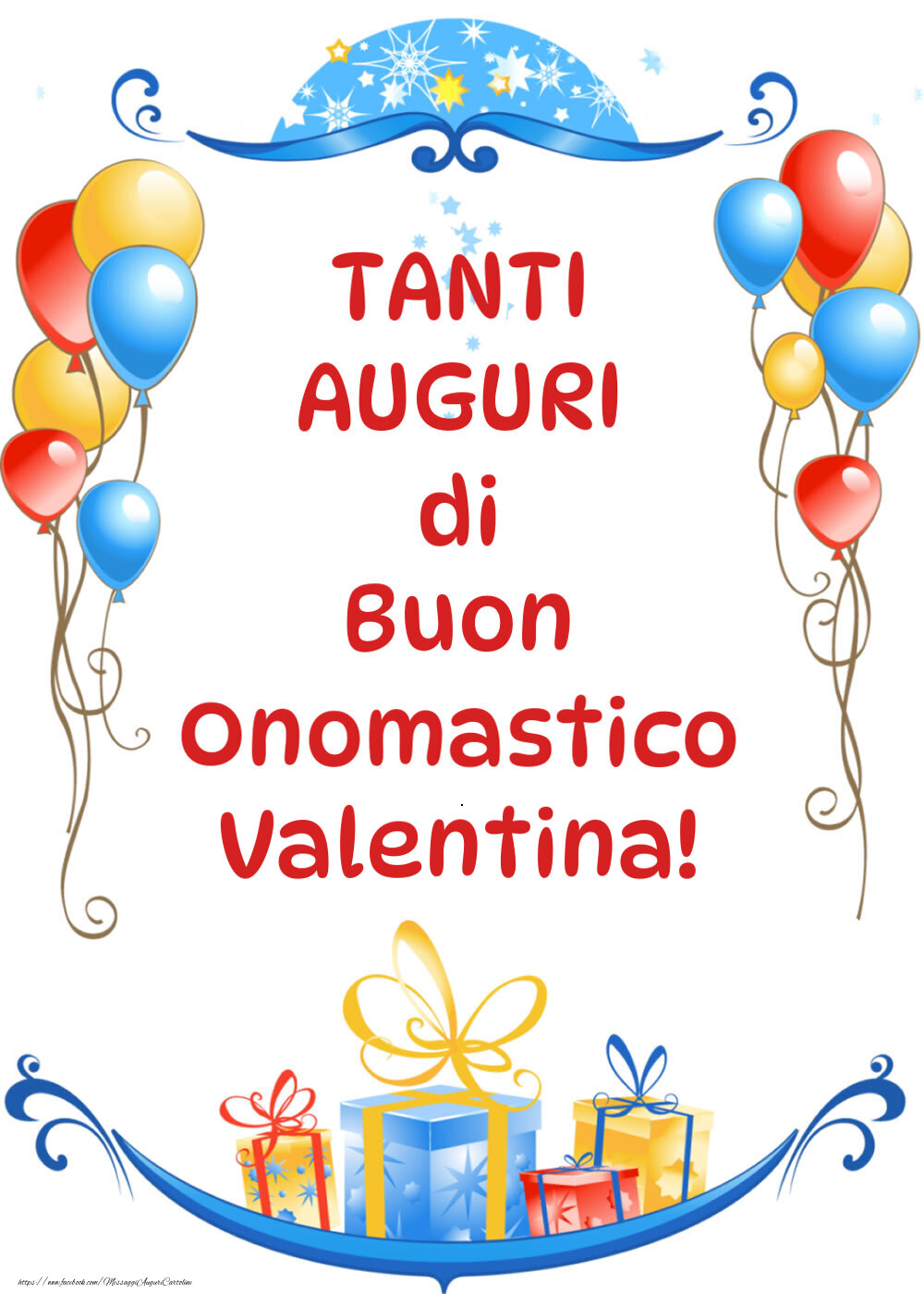 Cartoline di onomastico | Tanti Auguri di Buon Onomastico Valentina! - immagine con regali e palloncini colorati