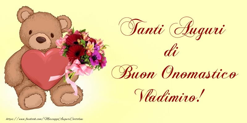 Tanti Auguri di Buon Onomastico Vladimiro! | Cartolina con orsacchiotto con cuore e mazzo di fiori | Cartoline di onomastico