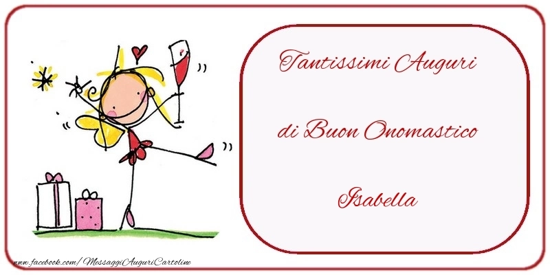 Cartolina con nome Isabella di onomastico con disegno divertente di una ragazza con champagne e regali e frase di buon onomastico Tantissimi Auguri di Buon Onomastico Isabella.