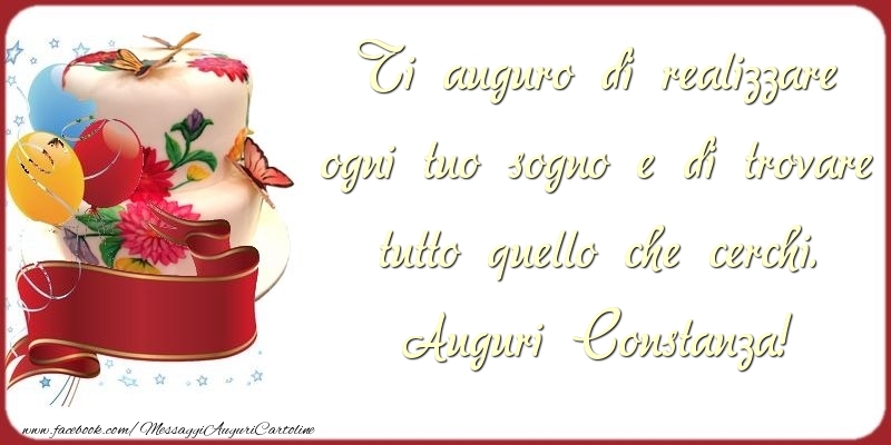 Ti auguro di realizzare ogni tuo sogno e di trovare tutto quello che cerchi. Constanza | Cartolina con torta, palloncini e farfalle | Cartoline di auguri