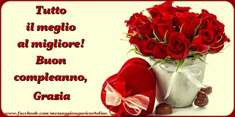 Con questa cartolina con rose e cuore, riuscirai a portare una gioia immensa al festeggiato nel giorno del suo compleanno. È un gesto piccolo, ma pieno d'affetto, che rimarrà per sempre nella sua memoria. Il nome Grazia è il fulcro di questo biglietto, inciso con eleganza e raffinatezza per far sentire davvero speciale il festeggiato nel giorno del suo compleanno. Questo biglietto di auguri di compleanno con il nome Grazia può essere scaricata gratis o inviare tramite Whatsapp, Facebook, Twitter, Pinterest. Immagine di buon compleanno con rose e cuore e dimensioni 800px x 400px.